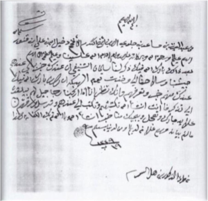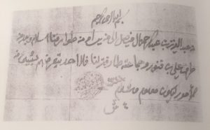 (بسم الله الرحمن الرحيم، من عبدالعزيز بن عبدالرحمن الفيصل إلى من يراه من طوارفنا السلام وبعد من طرف علي بن قنور وجماعته طارفة لنا فلا أحد يتعرضهم بشيء من الأمور ليكون معلوم والسلام 1321 الختم).